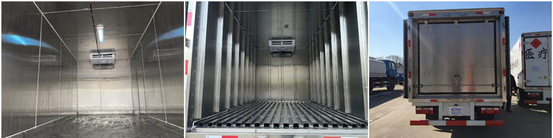 十 選裝配置:可選裝廂體側門(單側門或雙開門),可選裝鋁合金導風槽(導風槽有助于冷氣循環,提升制冷效果),可選裝廂體頂部加固肉勾滑道(直滑道 或 對接互通式拐彎滑道)。可選裝廂體內部采用全面不銹鋼材質(海鮮運輸必須加裝,海水有腐蝕性),可選裝280V-380V外接電源(停車熄火后可插電冷機繼續制冷工作),可選裝溫濕度監控記錄儀(帶打印功能)。