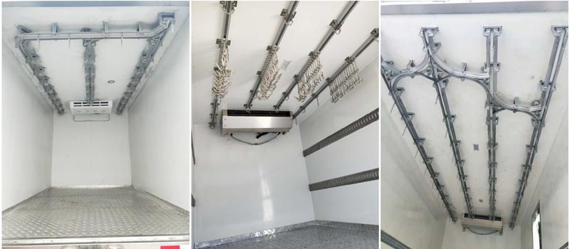 肉勾冷藏車在生產(chǎn)過程中,廂體必須加固,可根據(jù)客戶的要求加裝3條,4條,5條滑道。