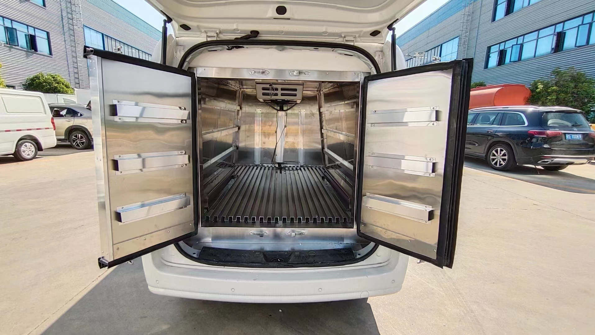 三、選裝配置:可選裝廂體側門(單側門或雙開門),可選裝鋁合金導風槽(導風槽有助于冷氣循環,提升制冷效果),可選裝廂體頂部加固肉勾滑道(直滑道 或 對接互通式拐彎滑道)。可選裝廂體內部采用全面不銹鋼材質(海鮮運輸必須加裝,海水有腐蝕性),可選裝280V-380V外接電源(停車熄火后可插電冷機繼續制冷工作),可選裝溫濕度監控記錄儀(帶打印功能)。