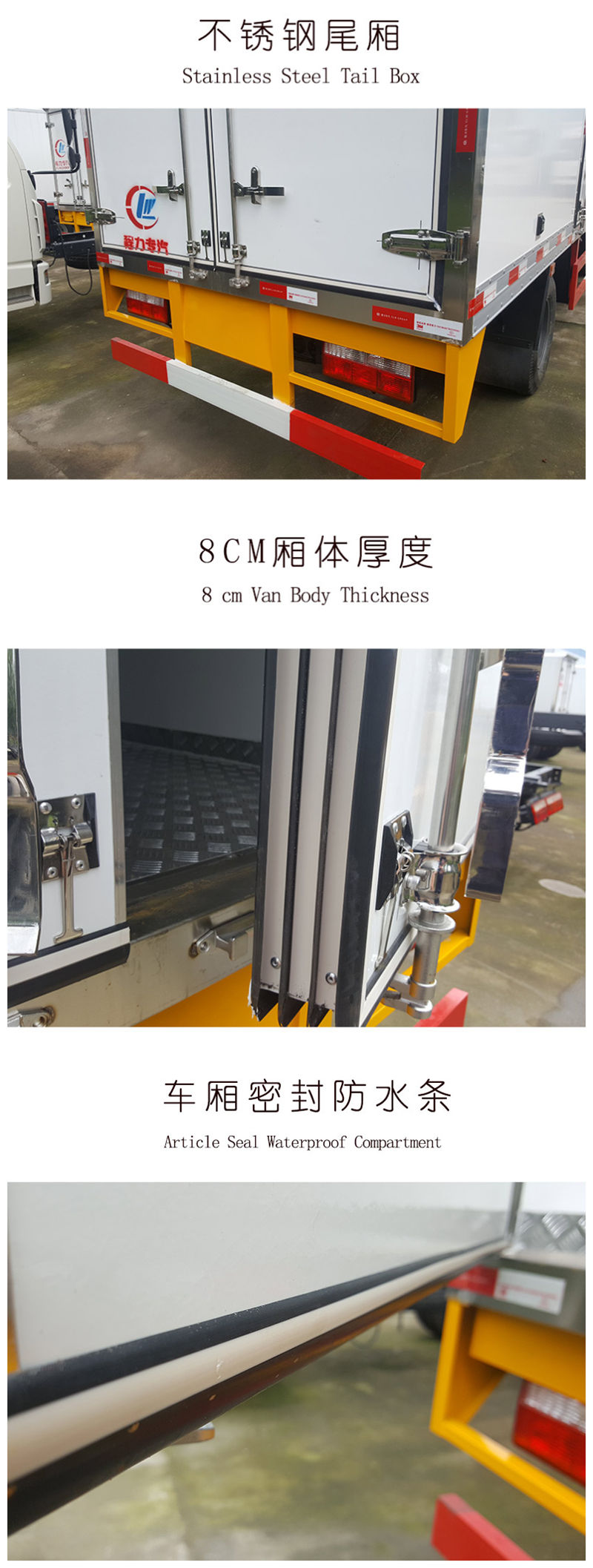 三、選裝配置:可選裝廂體側(cè)門(單側(cè)門或雙開門),可選裝鋁合金導(dǎo)風(fēng)槽(導(dǎo)風(fēng)槽有助于冷氣循環(huán),提升制冷效果),可選裝廂體頂部加固肉勾滑道(直滑道 或 對(duì)接互通式拐彎滑道)。可選裝廂體內(nèi)部采用全面不銹鋼材質(zhì)(海鮮運(yùn)輸必須加裝,海水有腐蝕性),可選裝280V-380V外接電源(停車熄火后可插電冷機(jī)繼續(xù)制冷工作),可選裝溫濕度監(jiān)控記錄儀(帶打印功能)。