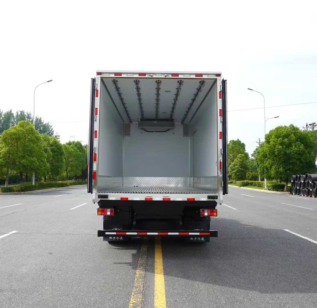 三、選裝配置:可選裝廂體側門(單側門或雙開門),可選裝鋁合金導風槽(導風槽有助于冷氣循環,提升制冷效果),可選裝廂體頂部加固肉勾滑道(直滑道 或 對接互通式拐彎滑道)。可選裝廂體內部采用全面不銹鋼材質(海鮮運輸必須加裝,海水有腐蝕性),可選裝280V-380V外接電源(停車熄火后可插電冷機繼續制冷工作),可選裝溫濕度監控記錄儀(帶打印功能)。