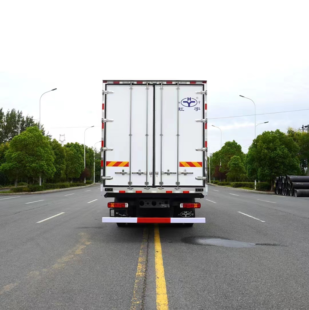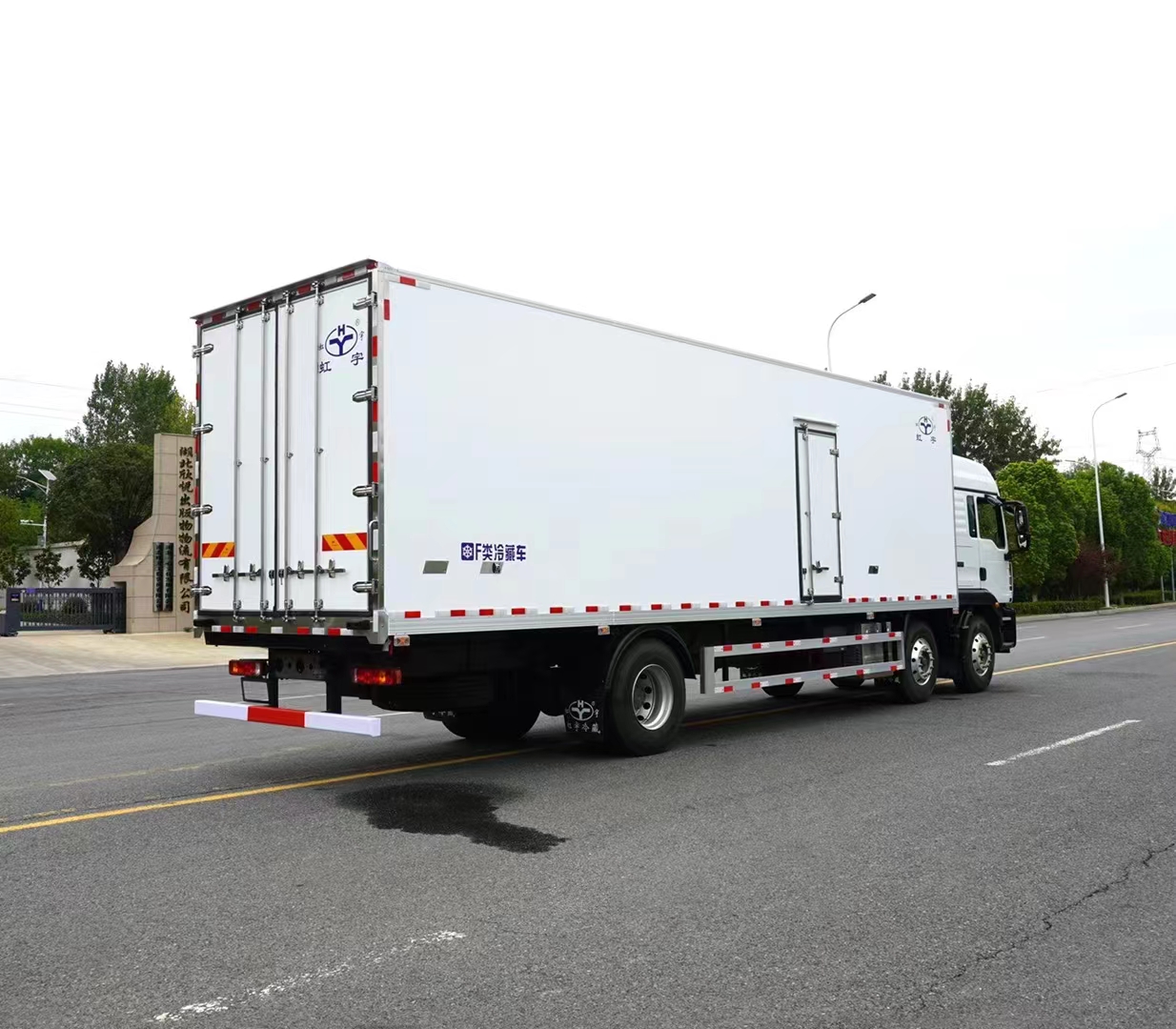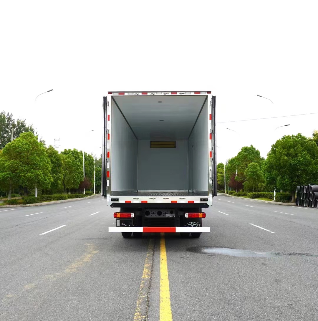 三、選裝配置:可選裝廂體側門(單側門或雙開門),可選裝鋁合金導風槽(導風槽有助于冷氣循環,提升制冷效果),可選裝廂體頂部加固肉勾滑道(直滑道 或 對接互通式拐彎滑道)。可選裝廂體內部采用全面不銹鋼材質(海鮮運輸必須加裝,海水有腐蝕性),可選裝280V-380V外接電源(停車熄火后可插電冷機繼續制冷工作),可選裝溫濕度監控記錄儀(帶打印功能)。