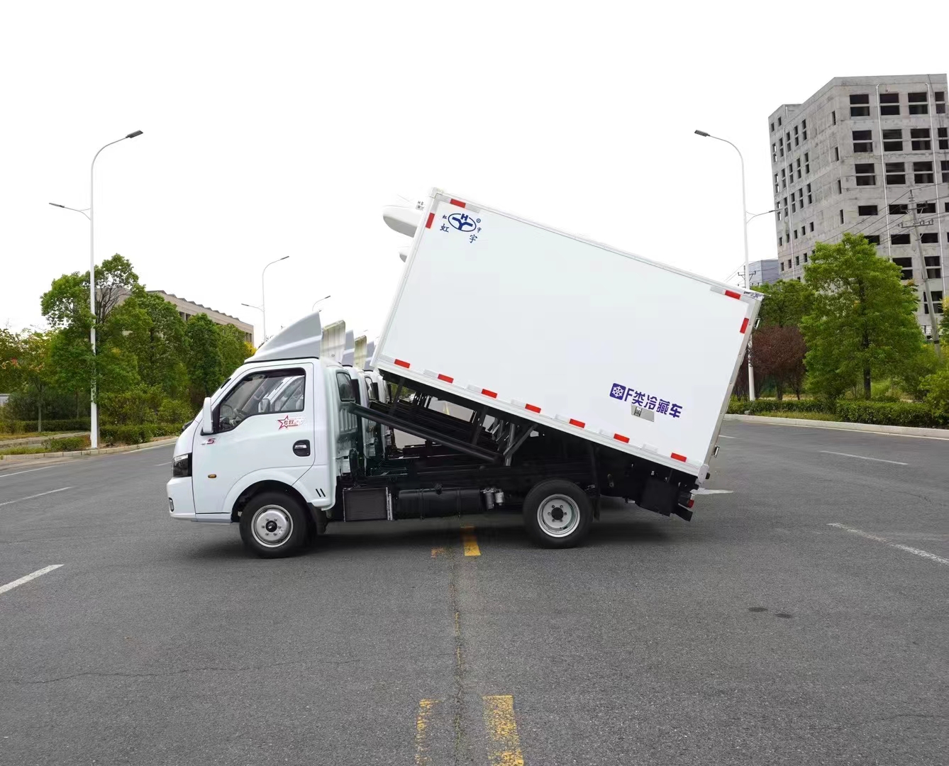 廂體自卸和舉升系統:由液壓缸,翻轉支架組成,安裝于病死豬運輸車上主要用于:病死豬在收到廂體內運輸到處理中心(處理站)后,通過液壓自卸裝置實現病死豬的自動傾卸,省時省力,安全快捷。