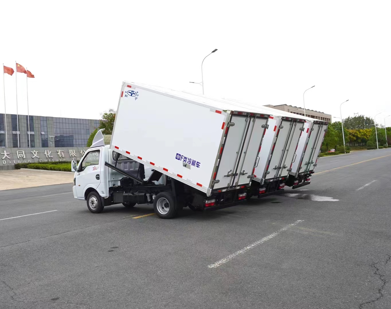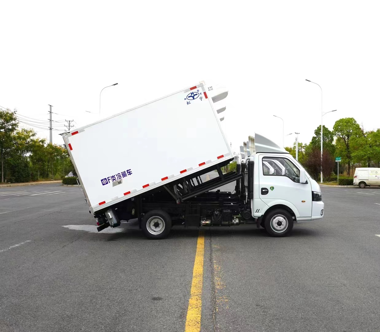 制冷系統:病死豬運輸車是由車載制冷機組實現無害化處理車內部空間氣體的流通和衡溫,為保證病死豬在運輸過程中對溫度的要求,保證車廂內溫度維持在-5°到-15°,有效減弱疫情病原的活性,保證工作人員的生命安全,在駕駛室就能實時監測到車廂內溫度的變化,便于控制溫度。