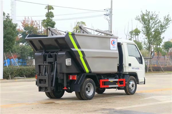 廂體尾部配置國標掛桶提升機,頂部翻轉,頂部加裝液壓刮板壓縮,壓縮比為2.5:1,尾部副梁加裝液壓支腿裝置,雙頂油缸舉升自卸,手電一體操作(可選遙控器)。