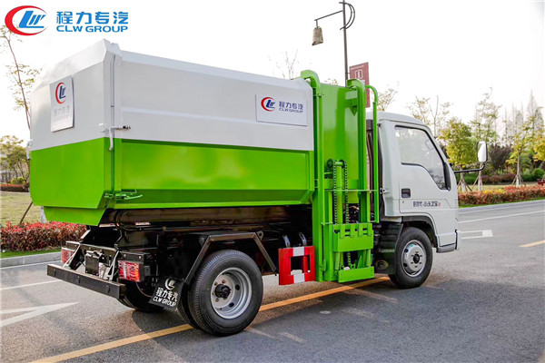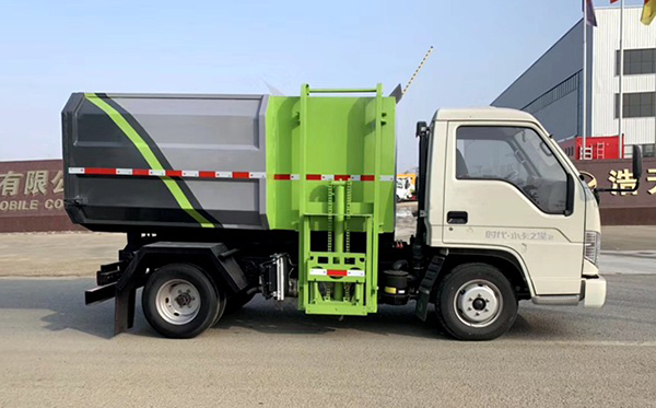 箱體采用邊三底四優質鋼板制作,箱體前部側面帶有掛桶提升機 構,可搭配120升或240升塑料垃圾桶,自動舉升垃圾桶倒入垃圾,提 升機頂部機械翻蓋,箱體底部雙液壓缸舉升自卸,箱體后方設有擋水 槽,尾部裝有橡膠密封條,防污水滴漏。